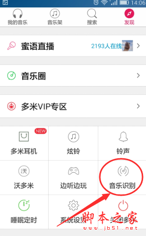 1、首先我们在手机中打开多米音乐并登录自己的账号,在“发现”页面中找“音乐识别”功能并打开,如下图所示:
