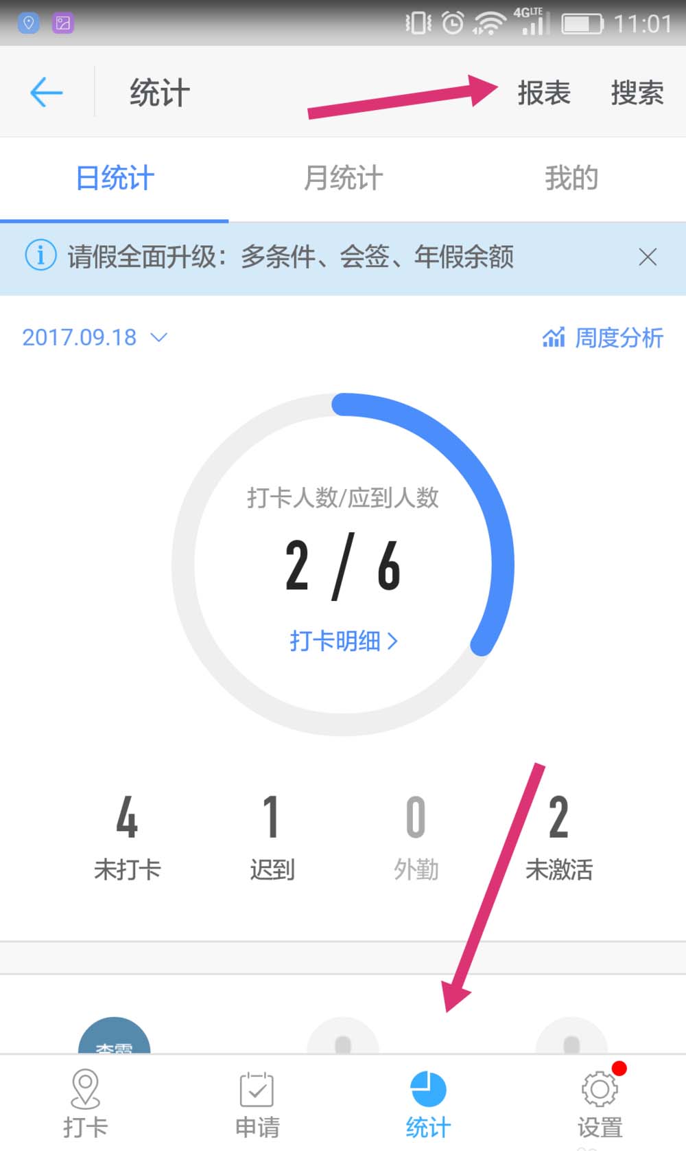 4、进入考勤打卡后。跳出统计界面选项。选择报表。