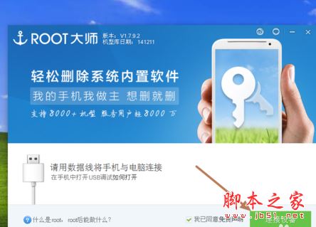1、在电脑上打开ROOT大师,将手机通过USB数据连接。