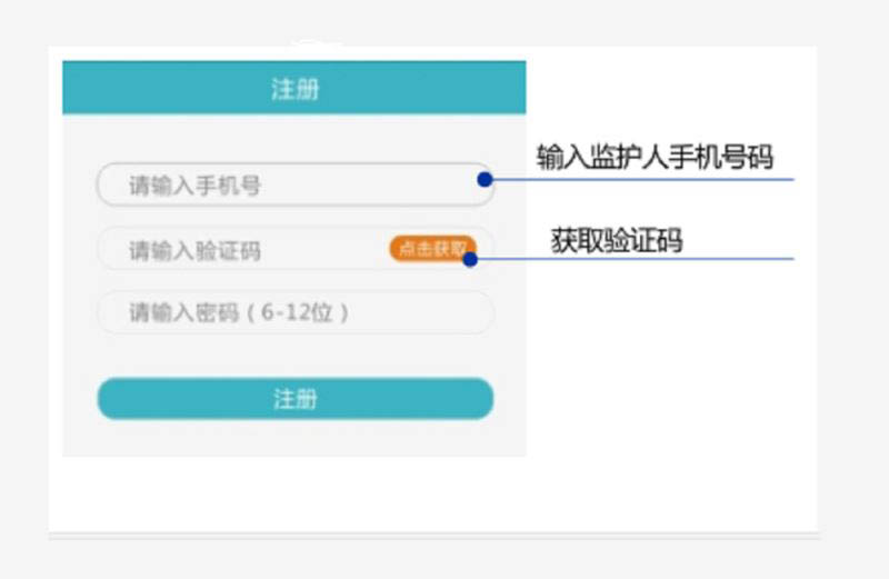 2、输入监护人手机号码,验证码等信息,点击注册。