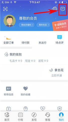 1)点开携程旅行APP,首先点击首页右下角处的【我的】,然后进入界面右上角处的【消息】图标;(如下图)