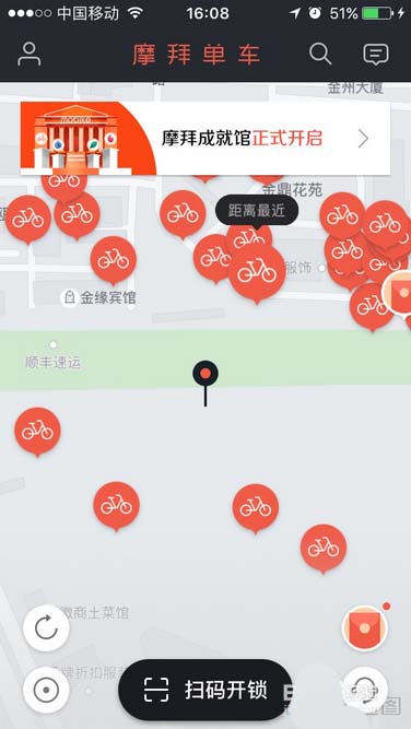 2、然后打开摩拜单车并且登录摩拜单车账号,在摩拜单车页面中我们就可以看到摩拜成就馆,点击摩拜成就馆就可以进入到里面。