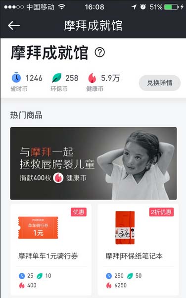 摩拜单车app在摩拜成就馆里面我们可以使用省时币、环保币、健康币兑换物品,下面我们就来看看详细的兑换方法,请看下文详细介绍。