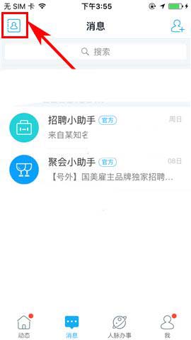 1)点开脉脉APP,首先点击首页下方的【消息】,随后再点击界面左上角处的【联系人】图标;(如下图)