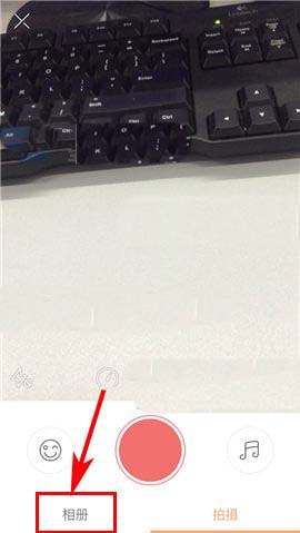1)点开快手APP,首先点击首页右上角处的【拍摄】按钮,随后选择界面中的【相册】;(如下图)