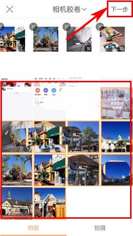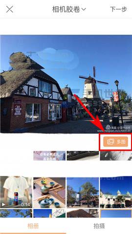 2)接着点击【多图】,然后再选择本地相册中的相应的照片,并点击【下一步】;(如下图)