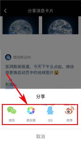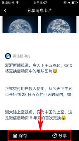 2)接着选择“保存”或“分享”(这里小编以“分享”为例),最后再选择所需的分享途径即可将该卡片分享至所指定应用中的相关好友处。(如下图)