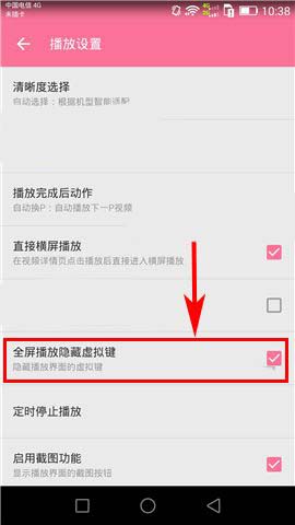 2)随后选择【播放设置】一栏,最后再勾选【全屏播放隐藏虚拟键】以开启该功能即可。(如下图)