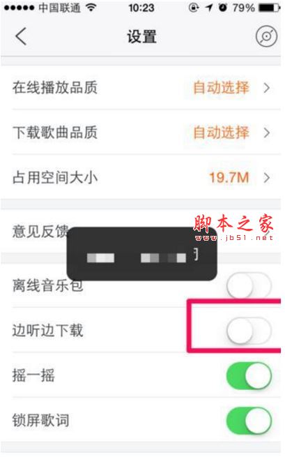 3、进入到虾米音乐设置界面以后,就能在设置界面中看到有一个边听边下载的功能,一般默认情况下这个功能是关闭的,点击这个功能右侧的小圆点处就可以开启这个功能。