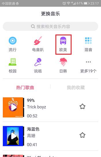 3、步进去选择背景音乐的界面,可以搜索歌曲和按分类选择,如下图所示: