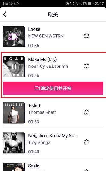 4、我们选择需要的音乐,点击确定使用并开拍,如下图所示: