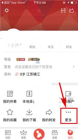 1)点开全民K歌APP,首先点击首页右下角处的【我的】,接着点击界面中的【更多】;(如下图)