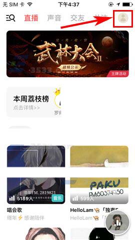1)点开荔枝FM,首先点击首页右上角处的个人用户头像,然后点击界面右上角处的【设置】图标;(如下图)