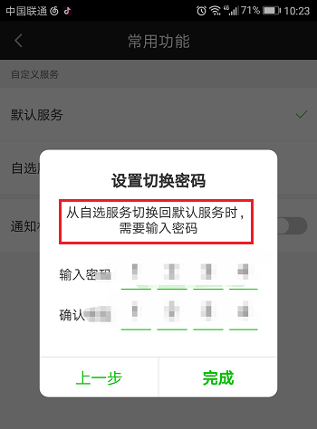5、需要设置切换密码,如果要从自选服务切换到默认服务,输入密码验证,如下图所示: