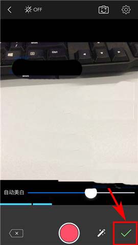 3)在一段视频拍摄结束时松开长按的按钮,最后再在录制了几段视频后,若确认结束后点击箭头所指的“对勾”图标即可将其保存并进入预览界面。(如下图)