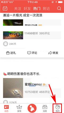1)打开全民K歌APP,首先进入“动态”界面右下角的【我的】,然后再点击屏幕右上角的【分享】图标;(如下图)