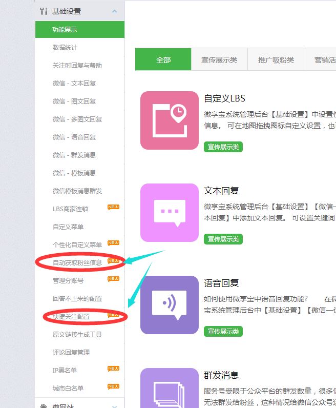 第二步:点击左侧自动获取粉丝信息,选择获取头像昵称等信息,保存;点击左侧快捷关注链接,把公众平台群发过的图文链接复制一个粘贴进去,保存。