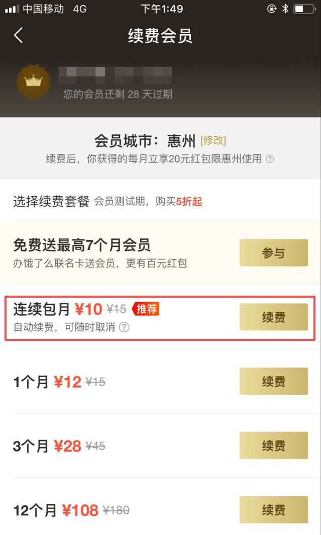 4、接下的来的页面会出现什么呢?对的,就是各种续费,扣毛爷爷的选项,我们选费用最便宜的“连续包月10”就可以了。