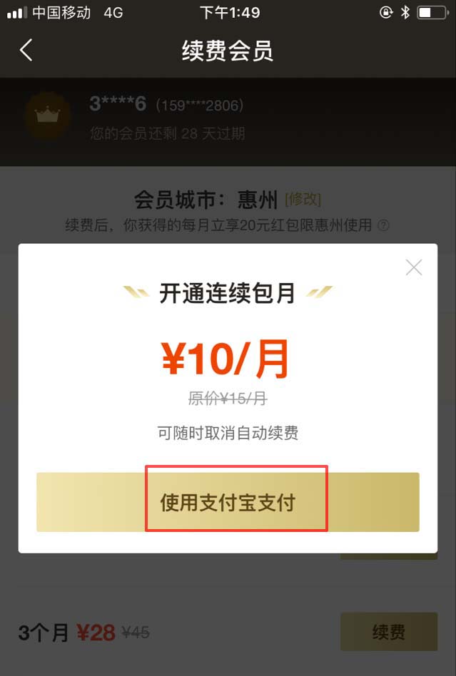 5、此时,APP会弹出开通连续包月的对话框哦,接下来“使用支付宝支付”就可以咯。“饿了么”会自动跳转到支付宝的页面哟。