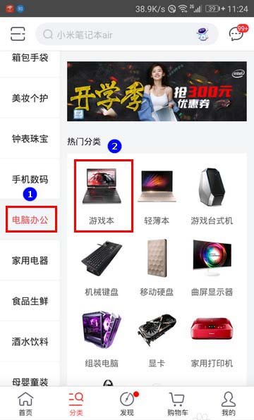 3、在这里,我以搜索自己需要的高性能笔记本为例,来教大家怎样在京东商城快速查找中意的商品。首先,点选“电脑办公”,再点击“游戏本”。