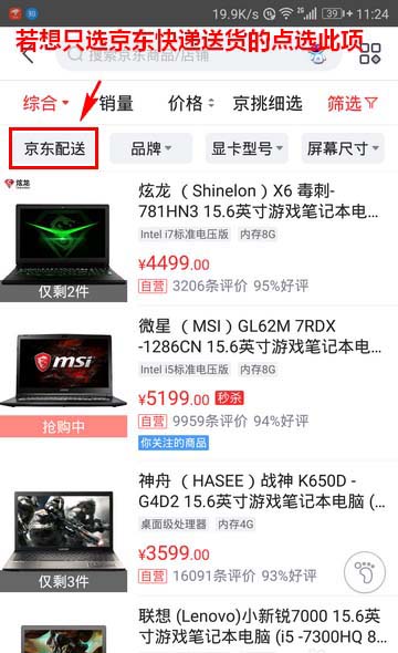 4、这时,将会打开商品列表页面。在这个列表页面中,如果你只想购买京东送货的商品,就点选“京东配送”这一项。注意,如果你只想购买京东自营的商品,一定要勾选此项。不过,需要指出的是,京东配送和京东自营并不能完全等同。它们的关系为:京东自营的商品一定是京东送货的,但京东送货的商品不全是京东自营商品,它们之间是一个包含关系。