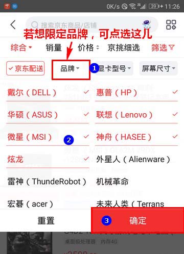 5、然后,如果你只对某些品牌的笔记本电脑感兴趣,就点击“品牌”一项,再根据自己的要求勾选一个或多个品牌,最后点击“确认”使该项选择生效。