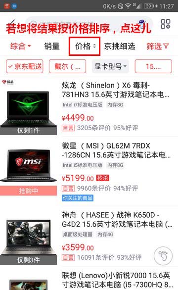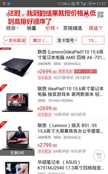9、这时,商品列表中列出的笔记本就是我们指定了快递、品牌、显卡、屏幕大小的本本了,并且已经按价格从低到高进行了排列。