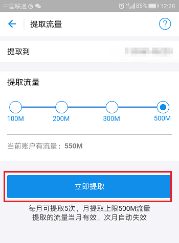 4、输入提取流量的数量,点击立即提取,如下图所示: