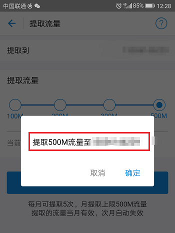 3、可以看到现有的流量,点击提取流量,这里也可以选择送流量,如下图所示: