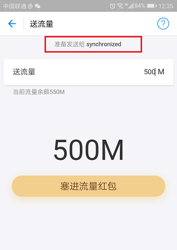 6、我们也可以返回上一界面,选择送流量,选择赠送的好友,然后点击送流量红包,等好友领取就赠送成功了,如下图所示: