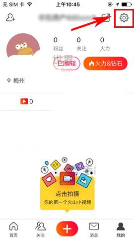 1)点开火山小视频APP,首先点击首页右下角处的【我的】,然后点击界面右上角处的【设置】图标;(如下图)