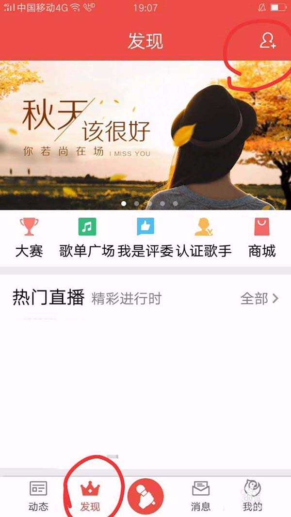 2、在登录后的个人主页面,我们找到下方的“发现”选项,然后用手点击一下,再点击一下该页面右上角的“添加”选项。