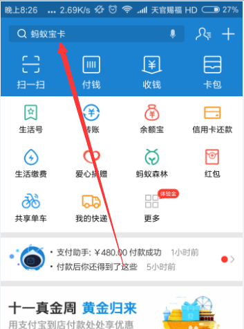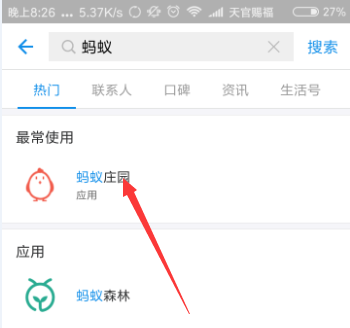 1、登陆支付宝后在最上方的搜索栏直接搜索蚂蚁庄园应用,如图所示。