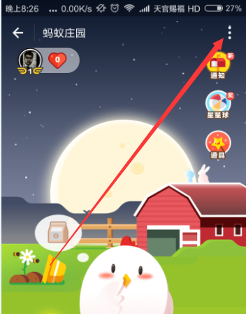 3、进入到自己的养鸡场后点击右上角的三个点命令菜单。