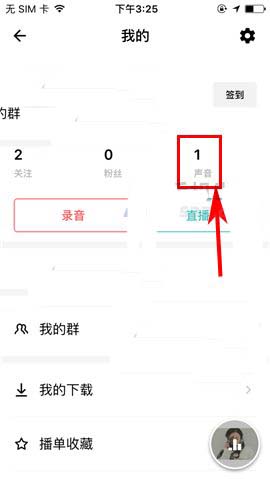 1)点开荔枝FM,首先点击首页右上角处的个人用户头像,然后进入【声音】(或草稿箱);(如下图)