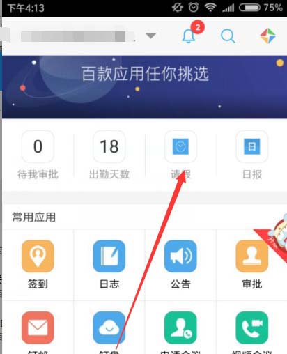 2、在上方就可以看到,有一个请假的功能,如图所示,点击可以填写申请请假的详细内容和时间等项目了。