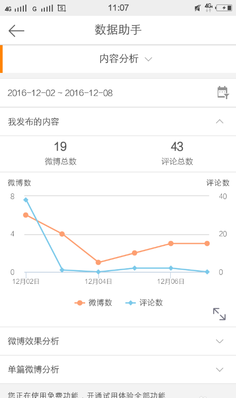 6、内容分析:这个功能是很强大的,可以查看微博总数,总评论数,还可以对单篇微博进行单独分析。
