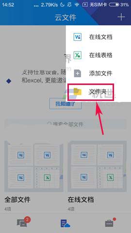 1)打开软件,点击最底端中间的【云文件】,接着点击右上角【+】符号,随后点击【文件夹】;(如下图)