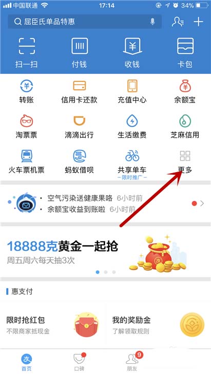 1、打开你的支付宝app,然后选择更多选项。