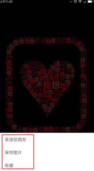 5、点击生成的图片,会自动放大,默认为黑色背景。长按后可以发送给朋友或者保存到手机。