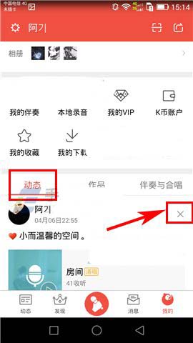 1)打开全民K歌,首先点击首页右下角处的【我的】,随后在“动态”列表中选择所要删除的动态,点击其右上角处的【x】图标;(如下图)