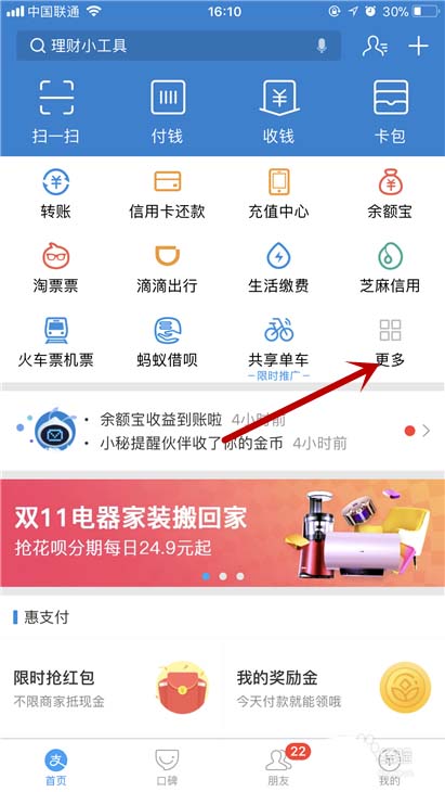 1、打开你的支付宝app,然后进入主界面之后,点击一下你界面中的更多选项。