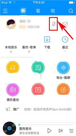 1)打开酷狗音乐APP,首先点击首页中箭头所指处的【麦克风】图标,然后进入【识别历史】;(如下图)