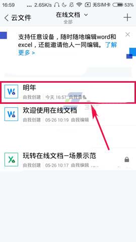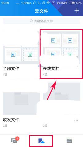 1)打开软件,点击最底端的【云文件】,再点击【在线文档】,选择一个文档并点击;(如下图)