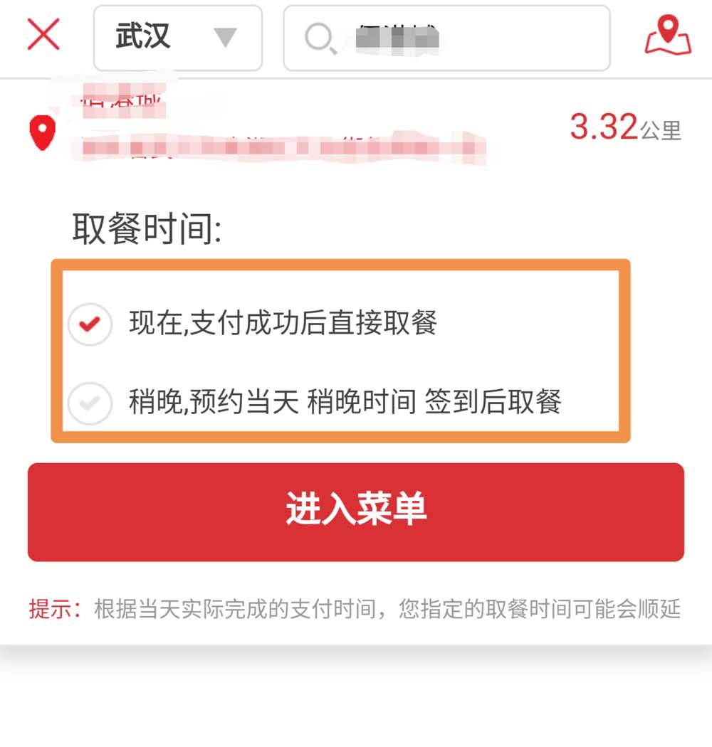 2、选择取餐的餐厅。在这类有两种选项,支付成功后”直接取餐”只需等候几分钟就可取餐。“预约当天”则可以自己选择时间段到店签到取餐。