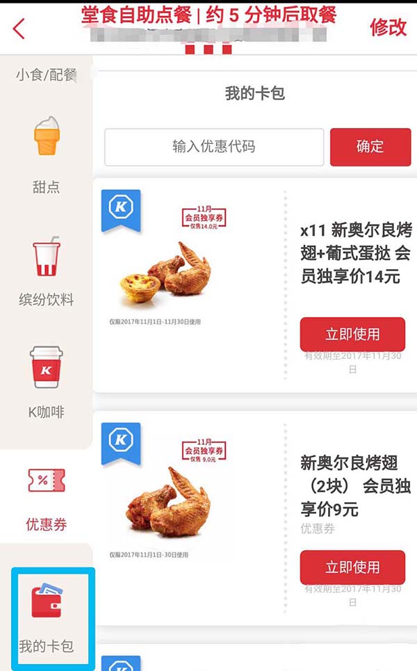 4、如果你是肯德基会员,那么直接点击“我的卡包”就可以使用优惠券啦!周二会员日还可用积分换购商品。
