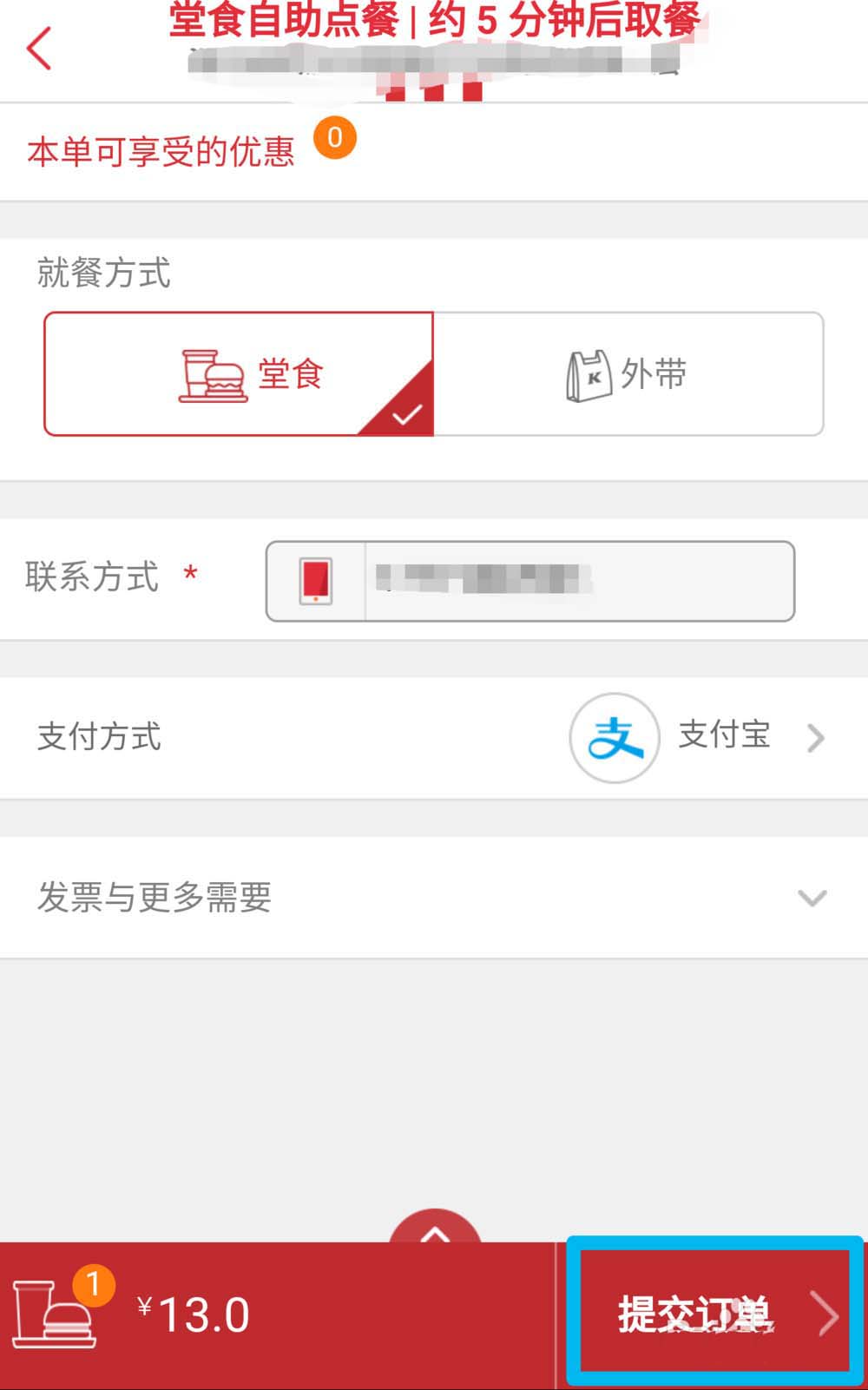 6、在支付页面可选择“堂食”或“外带”。联系方式十分重要,支付成功后会有一条带有取餐好的短信到您的手机。还有支付方式及发票等选项。全部完成后就可以点击“提交订单”付款啦。