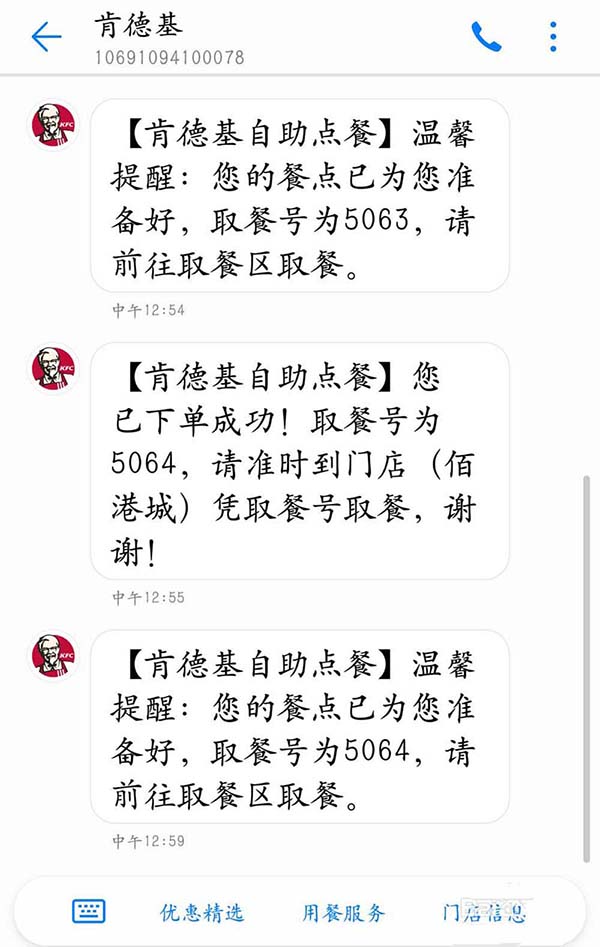 7、付款完毕后系统会自动生成取餐号,也会发一条短信到您的手机。在店员叫到您的手机尾号或取餐号时就可上前取餐享受美食啦!