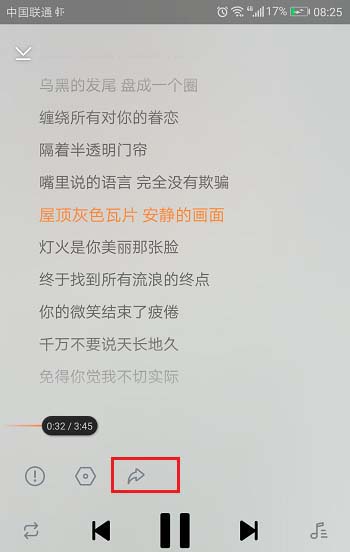 4、向左滑动之后可以看到已经切换到了歌词界面,点击下面的的转发图标,如下图所示: