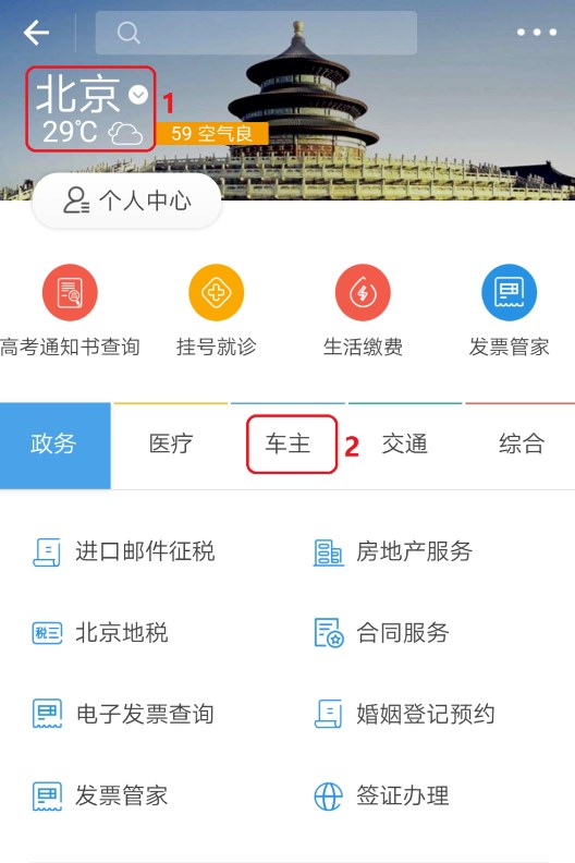 2、在“城市服务”页面中,首先确认所显示城市(第一张图中1的位置)是否正确,如果错误,直接点击城市就会打开城市设置页面,如果正确,直接选择“车主”分类(第一张图中2的位置),在“车主”服务分类里,找到“机动车服务”并点击,